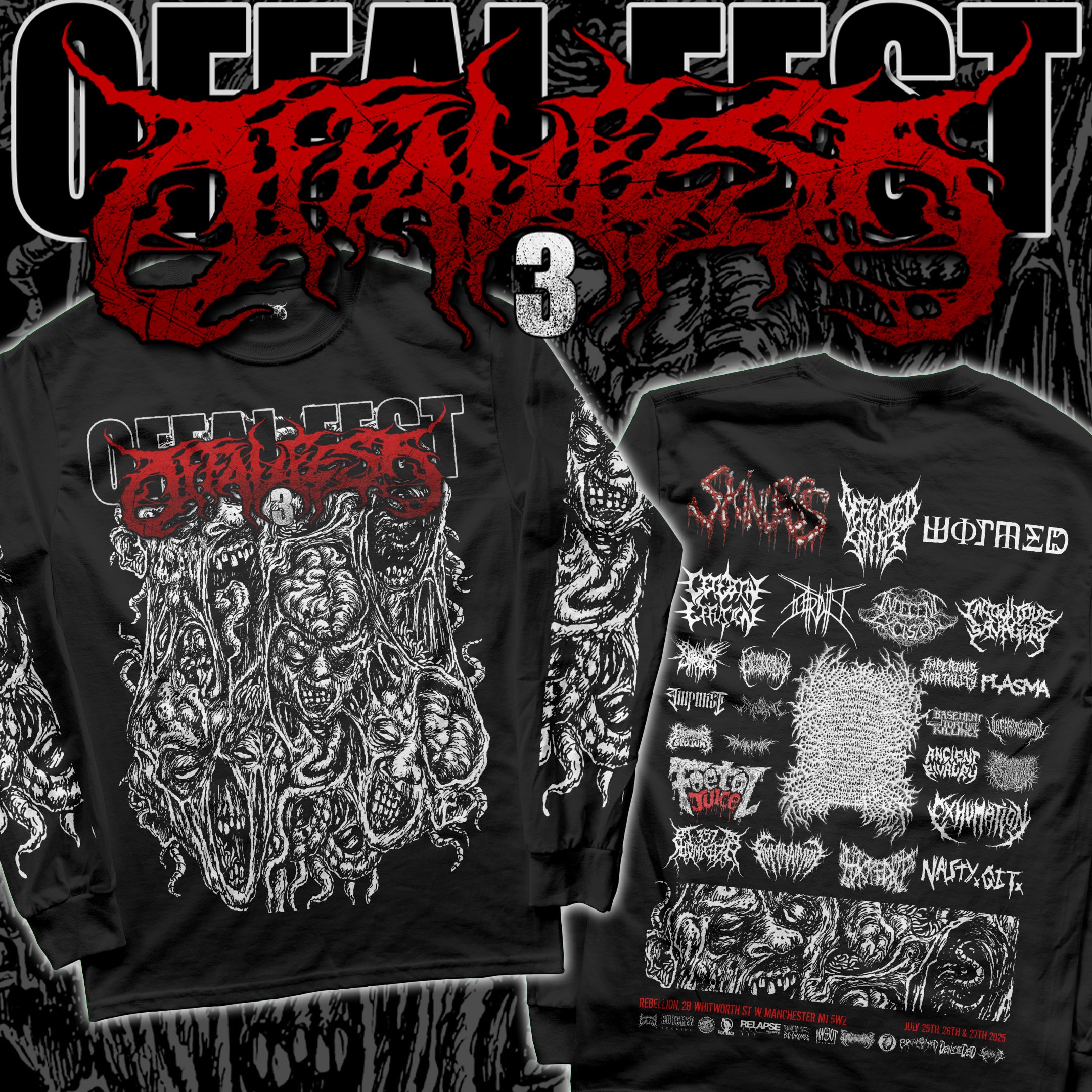 Official Offal Fest 2025 Longsleeve, sporting a brutal design on the front and the lineup on the back!